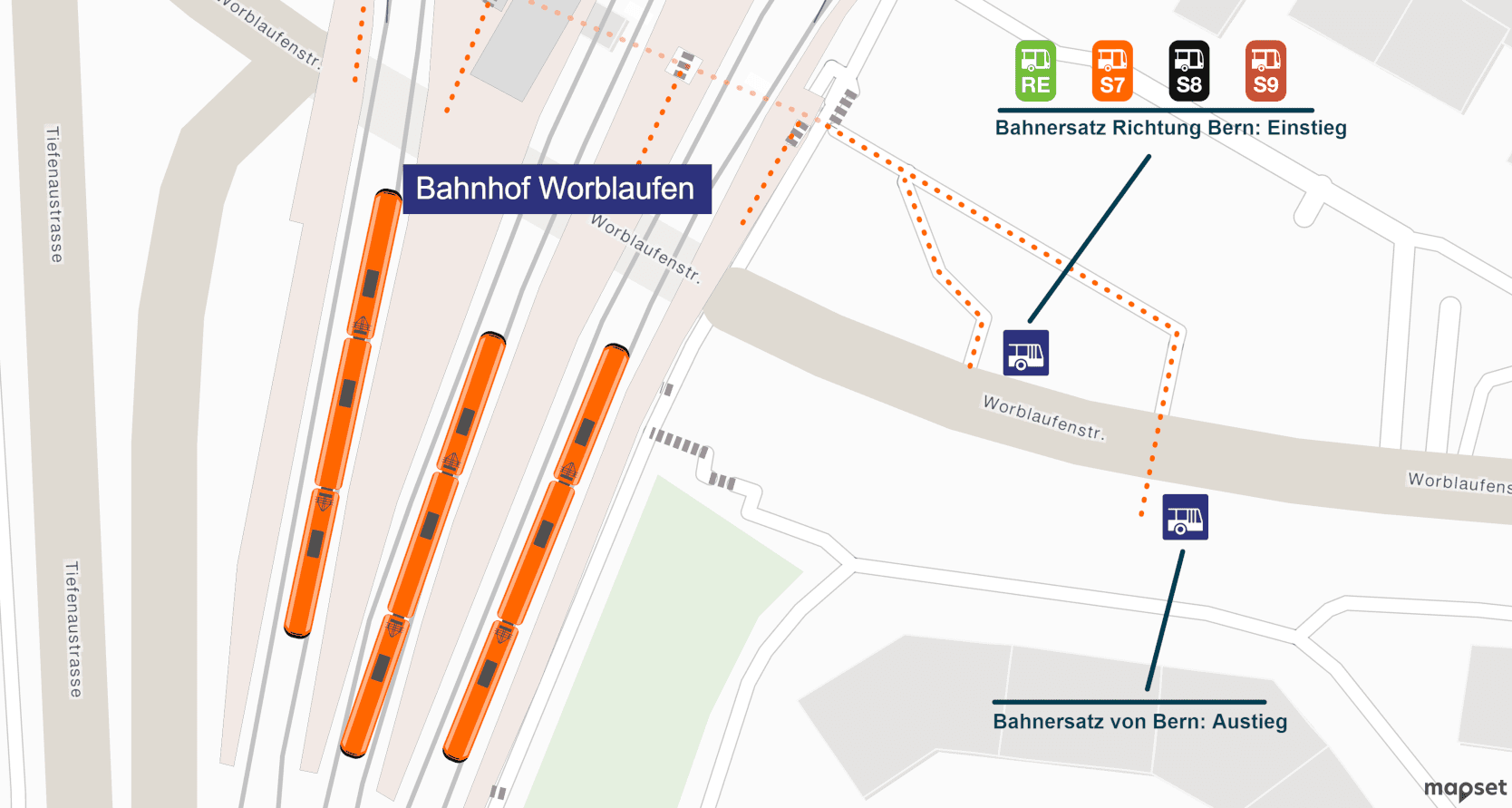 Obwohl es gerade eine grosser Vorteil von mapset ist, dass damit erstellte Pläne dem offiziellen Kartenbild der SBB entsprechen, hatten einige Kunden den Wunsch, ihre eigenen Piktogramme und Schriften in mapset zu verwenden. Neu besteht daher die Möglichkeit, für Kunden ein eigenes Corporate Design zu integrieren. Für den RBS und die VBZ haben wir bereits entsprechende Anpassungen vorgenommen. Die Abbildung zeigt ein Beispiel eines Bahnersatzplans von Worblaufen, in dem die speziellen Linienpiktogramme des RBS in mapset übernommen wurden. Sichtbar ist auch, dass im Rahmen des Corporate Designs Bilder in die mapset-Pläne integriert werden können, im Beispiel sind es Schema-Bilder von RBS-Zügen.