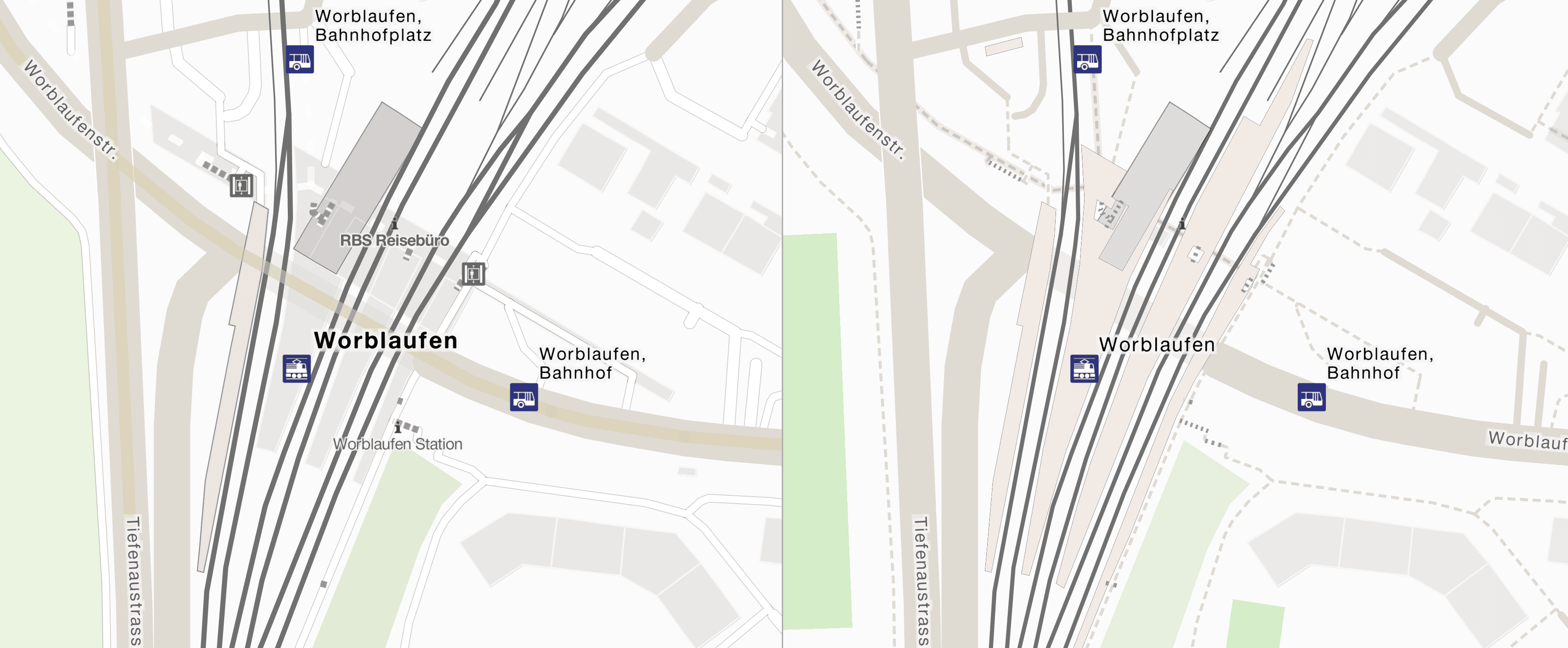 Am Beispiel Worblaufen sind die Verbesserungen vom alten (links) zum neuen Kartenbild (rechts) gut erkennbar.