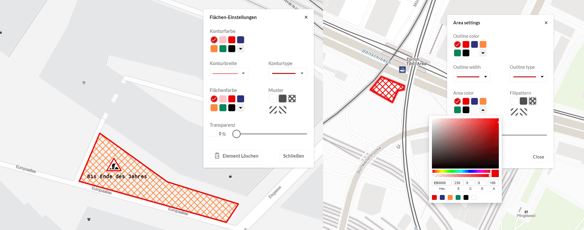 Ab sofort haben Sie die Möglichkeit, Ihre Pläne durch das Einzeichnen von Polygon-Flächen noch informativer zu gestalten. Beispielsweise lassen sich Baustellen oder andere Ereignisse an Haltestellen, Bahnhöfen und im Umfeld grafisch darstellen. Mit Hilfe des überarbeiteten Feature-Stylers können diese Flächen nach Belieben gestaltet werden. Zur Gestaltung der Flächen stehen unterschiedliche Linien und Füllmuster zur Verfügung.