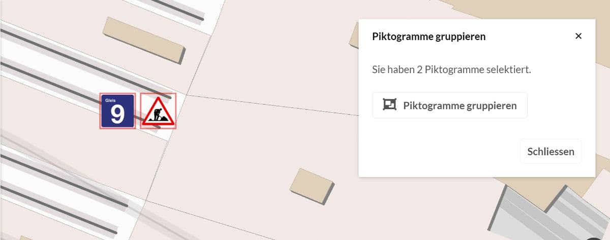 Wussten Sie, dass sich Piktogramme zu Gruppen zusammenfassen lassen? Die Funktion ist wichtig, wenn Piktogramme ihre relative Position zueinander beibehalten sollen, wenn die Karte gezoomt wird. Zum Gruppieren halten Sie die CTRL-Taste (Apfel-Taste bei Mac) gedrückt und klicken nacheinander die zu gruppierenden Piktogramme an. Darauf erscheint ein Dialog, mit dem die Gruppierung eingestellt werden kann. Wenn Sie eine Gruppe von Piktogrammen anklicken, erscheint direkt dieser Dialog, mit dem die Gruppierung rückgängig gemacht werden kann.